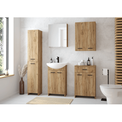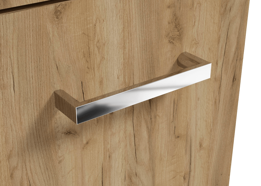 Fronty mebla są inspirowane wyglądem naturalnego dębu. W zestawie dołączone są dwupunktowe, metalowe uchwyty dwóch kolorach - czarnym (mat) i chrom (połysk). Dzięki temu szybko możesz dopasować szafkę do aranżacji pomieszczenia albo odświeżyć jego wygląd. Inspirowane drewnem meble pasują do wnętrza w każdym kolorze i stylu, są również ponadczasowe.