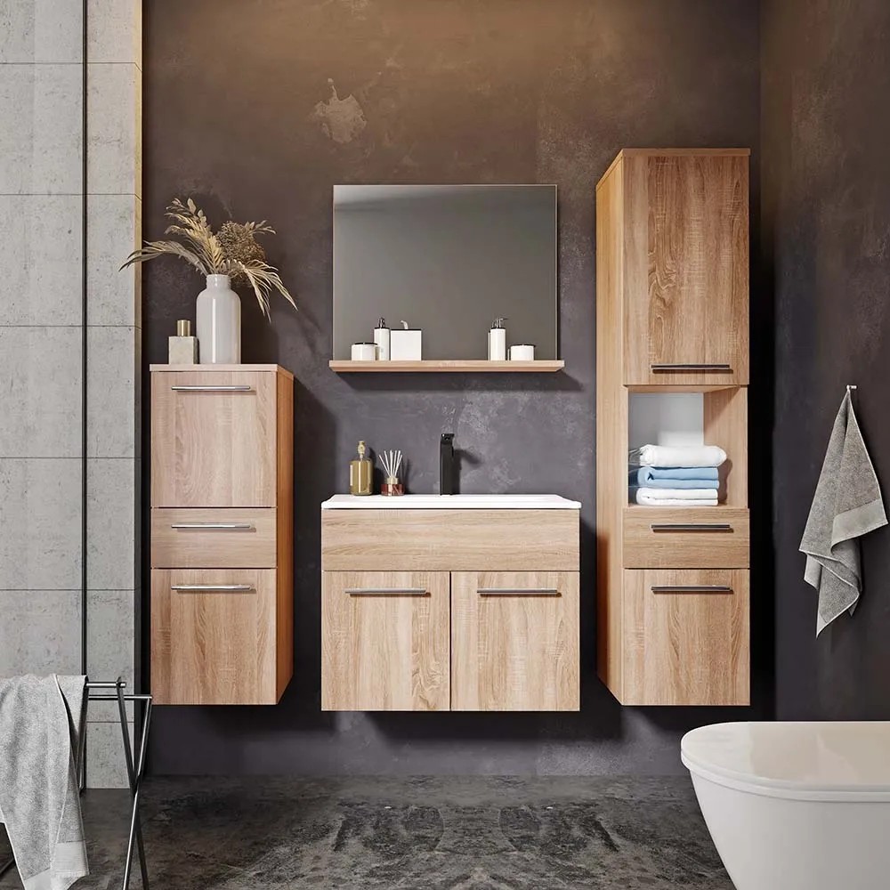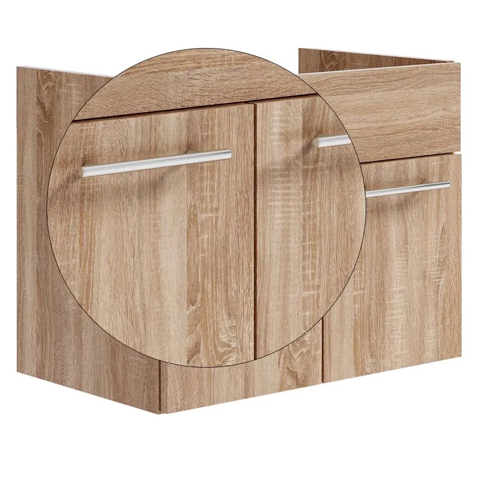 Szafka jest częścią serii mebli łazienkowych Rita. Charakteryzują się one nowoczesnym a jednocześnie eleganckim wyglądem. Fronty w kolorze drewna dębowe połączone są z prostymi uchwytami w kolorze chrom. Ten ponadczasowy design będzie się pięknie prezentować we wnętrzu, niezależnie czy zdecydujesz się na wzorzyste czy gładkie płytki.