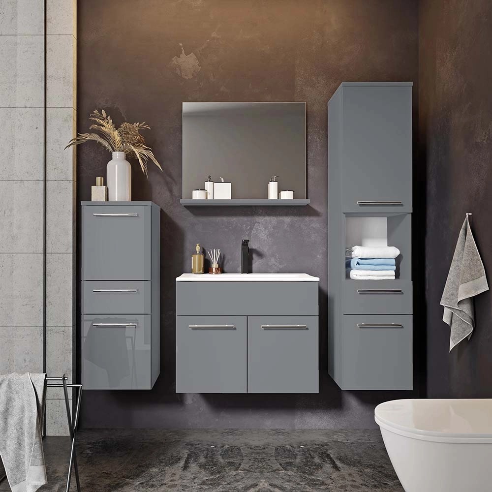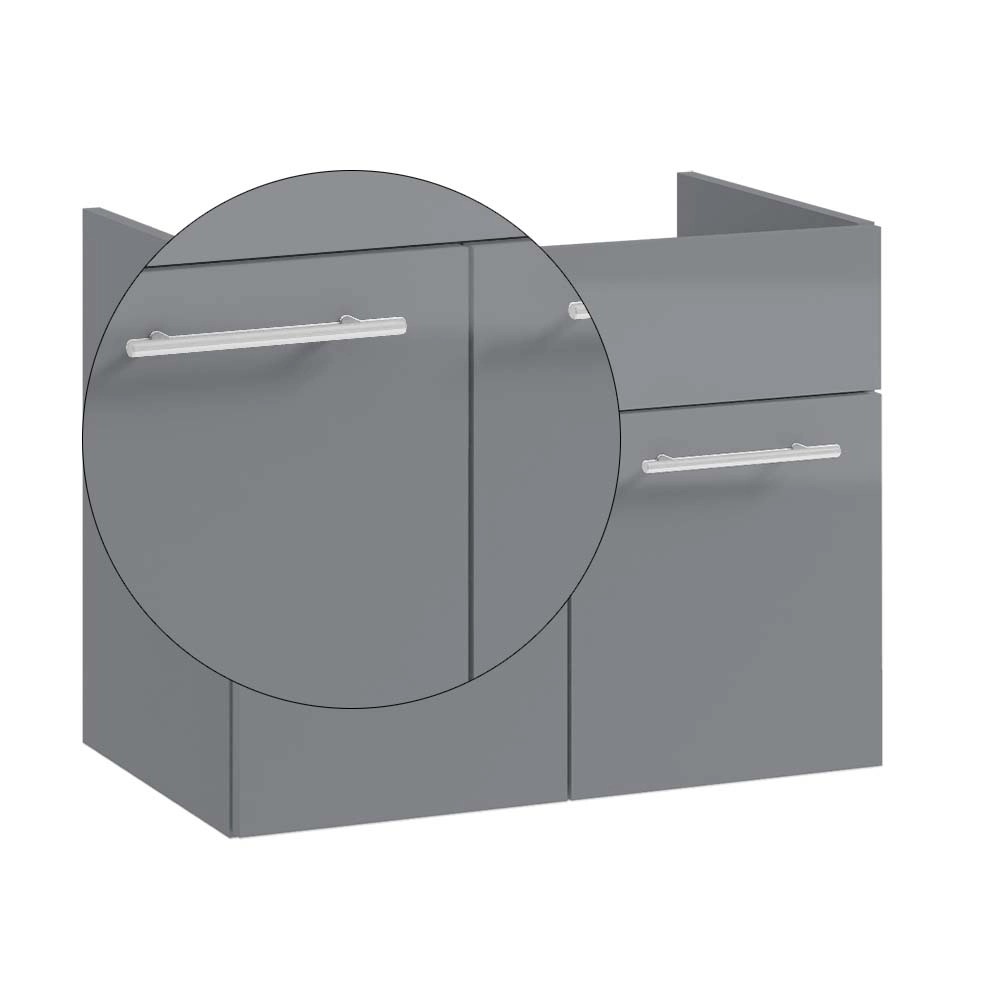 Szafka jest częścią serii mebli łazienkowych Rita. Charakteryzują się one nowoczesnym a jednocześnie eleganckim wyglądem. Błyszczące fronty w głębokim szarym kolorze połączone są z prostymi uchwytami w kolorze chrom. Nieco minimalistyczny design będzie się pięknie prezentować we wnętrzu, niezależnie czy zdecydujesz się na wzorzyste czy gładkie płytki.
