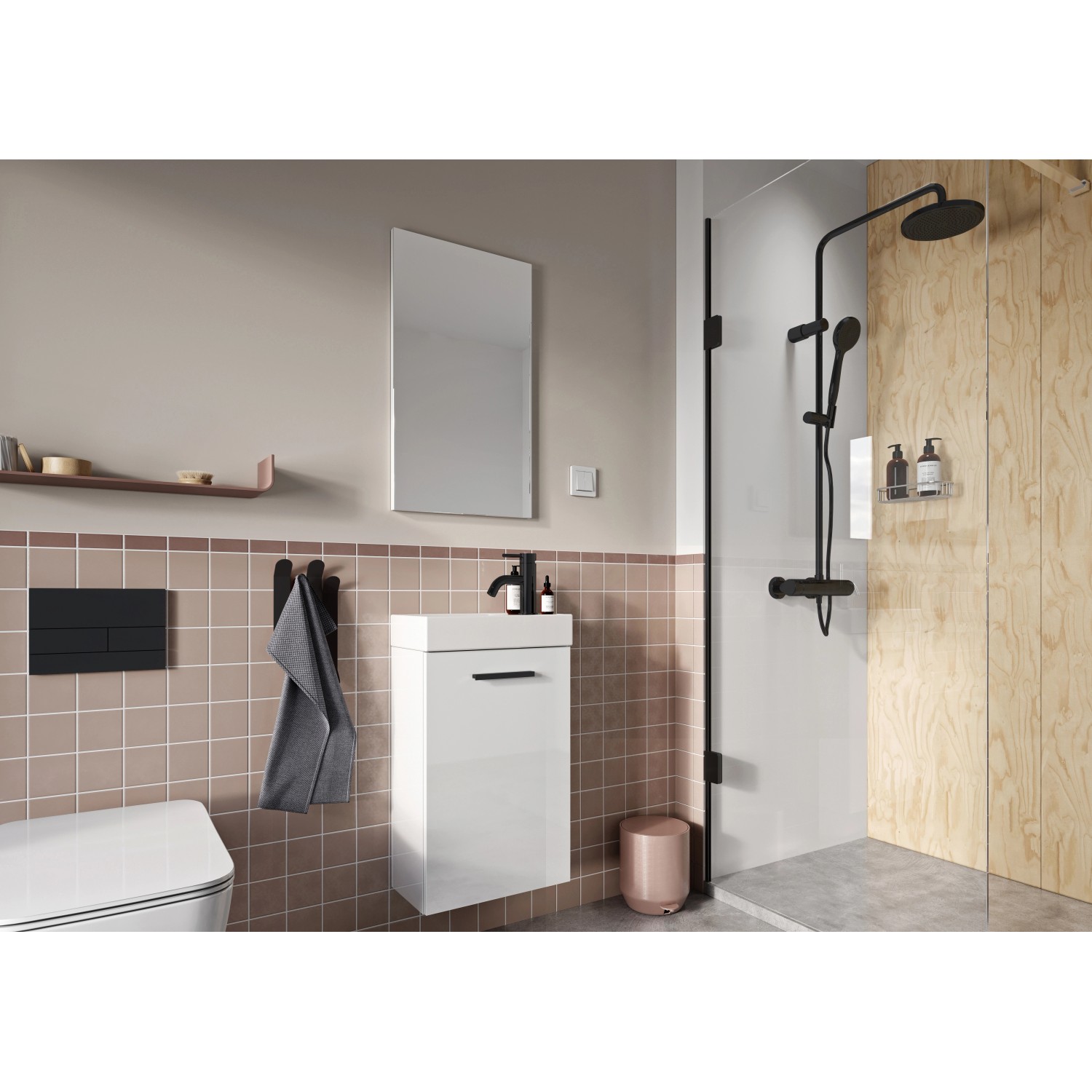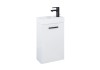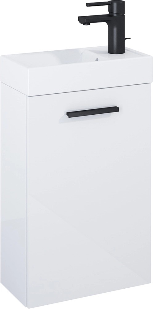 Doskonałej jakości szafka łazienkowa z umywalką. Umywalka w kolorze białym, wykonana z ceramiki. Uchwyt szafki w kolorze czarnym. Zestaw jest prosty i szybki w montażu.