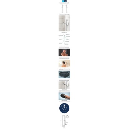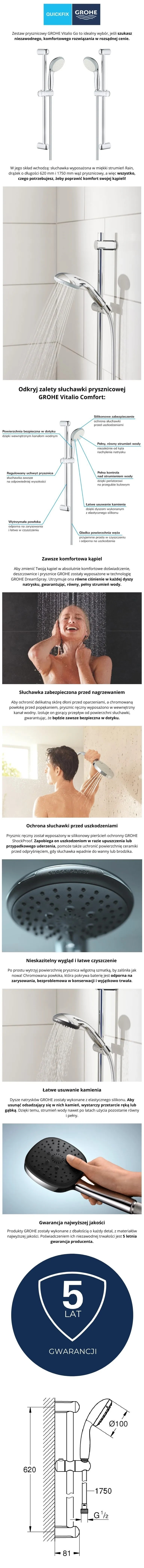 Z zestawem prysznicowym Grohe Vitalio Go 100, na nowo odkryjesz komfort codziennej kąpieli. W jego skład wchodzą 620 mm drążek, 1750 mm wąż i poręczna słuchawka prysznicowa, oferująca cudownie miękki, delikatny strumień Rain. Całość została pokryta chromowaną powłoką Grohe StarLight, która nie tylko znakomicie się prezentuje, ale też chroni przed uszkodzeniami i zmatowieniem, gwarantując nieskazitelny wygląd przez lata eksploatacji. Dla zapewnienia jak najwyższej wygody użycia, w słuchawce wykorzystano technologię DreamSpray, która odpowiada za utrzymanie równego ciśnienia w każdej dyszy, co przekłada się na wyjątkowo pełny strumień wody. Aby móc się cieszyć nim jak najdłużej, końcówki dysz zostały wykonane z silikonu SpeedClean, dzięki czemu wystarczy je przetrzeć, by pozbyć się osadów z kamienia. Wszystko to sprawia, że zestaw prysznicowy GROHE Vitalio Go 100 to znakomity wybór dla każdego miłośnika komfortowych kąpieli i trwałych, nowoczesnych rozwiązań - już dzisiaj zaproś go do swojej łazienki!