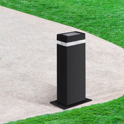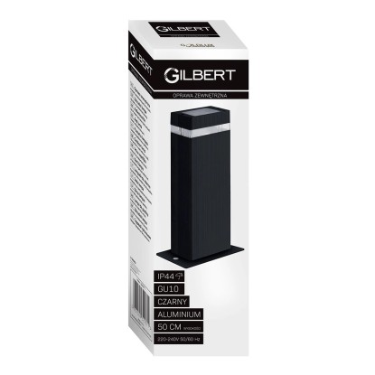 Lampa zewnętrzna stojąca o wysokości 50 cm wykonana z aluminium w kolorze czarnym, osłonięta przezroczystym kloszem. Doskonale sprawdzi się jako oświetlenie ogrodu czy podjazdu. Nowoczesny design, prosta forma i uniwersalna kolorystyka to cechy serii oświetlenia GILBERT - do nabycia również kinkiety mocowane do ściany.