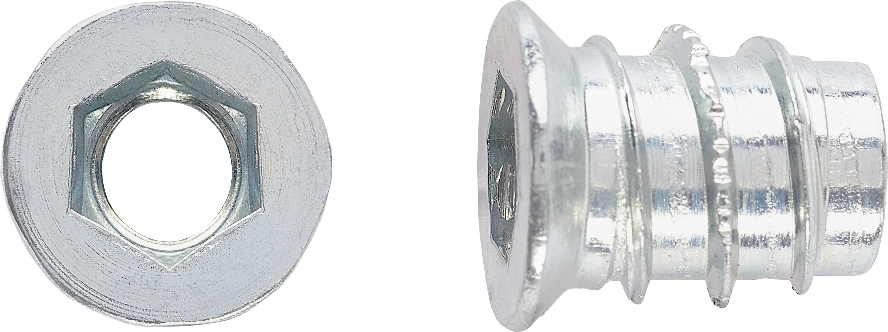 Następnie wkręcamy mufę do otworu w płycie lub drewnie - dzięki temu uzyskujemy gwint metryczny, w który możemy wkręcić np. stopkę regulowaną do mebla.