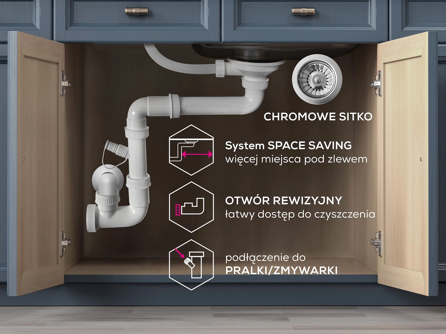 Informacje dodatkowe: syfon manualny "Space Saving", drewniana deska do krojenia w komplecie