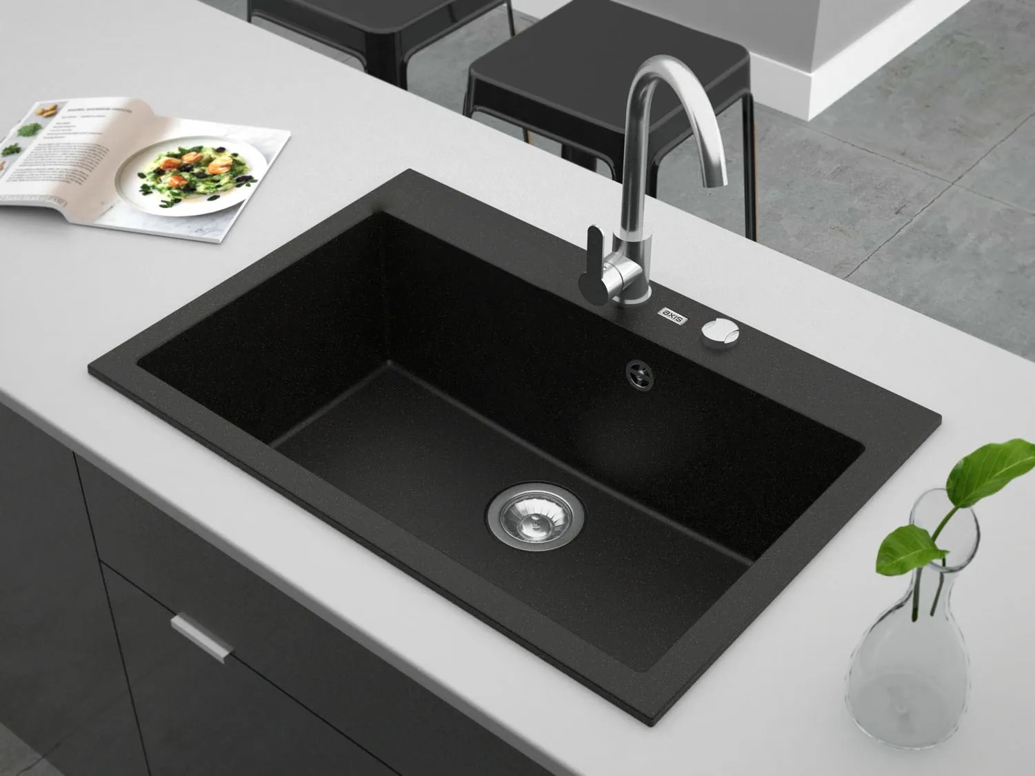 Wykonany został z wysokiej jakości kompozytu o nazwie axi-gran. Materiał ten jest bardzo zbliżony do granitu, dlatego też zlew jest odporny na szkodliwe czynniki, takie jak promieniowanie UV, wysoka i niska temperatura, czy też uszkodzenia mechaniczne. Do tego materiał przez długi czas zachowuje swój oryginalny wygląd.