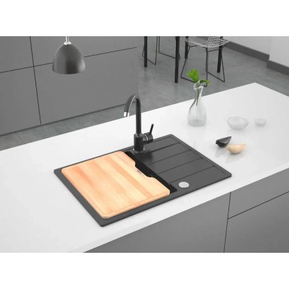 Zlew granitowy 1-komorowy z krótkim ociekaczem z deską oraz baterią w kształcie U w dopasowanym kolorze, grafitowy