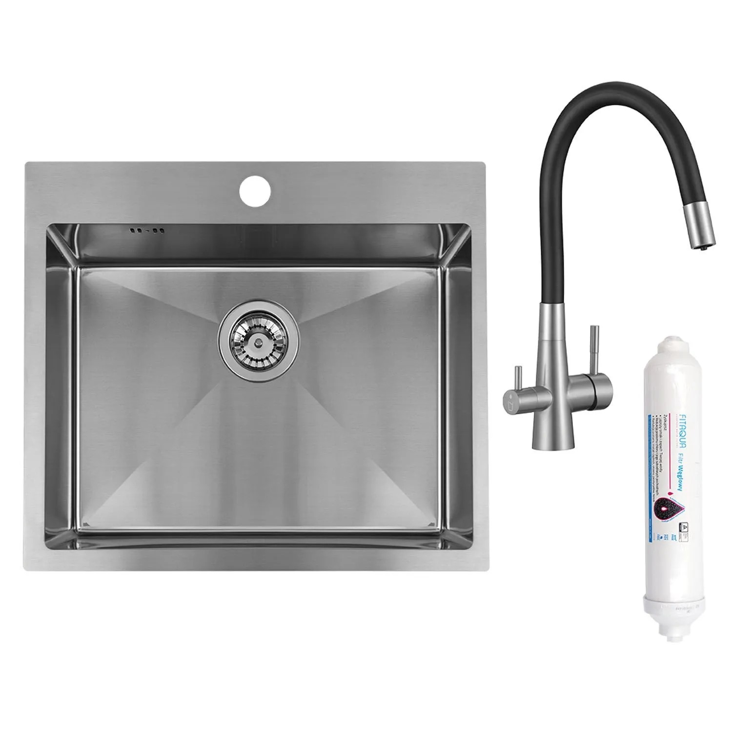 W zestawie znajduje się syfon typu Space Saving, pozwalający na maksymalne wykorzystanie przestrzeni w szafce pod zlewem oraz bateria kuchenna Riveco z elastyczną wylewką, wyposażona w system filtracji wody, który umożliwia jej oczyszczanie.